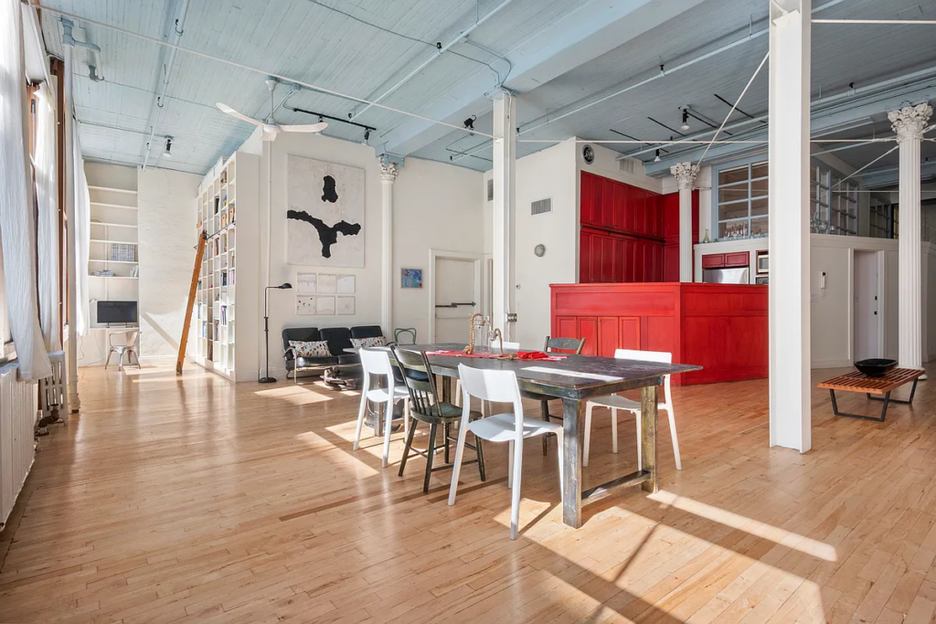 Our sun-drenched Soho loft embodies downtown Manhattan’s creative spirit. Oversized windows bathe the space in natural light, illuminating original hardwood floors and exposed ceilings that honor the neighborhood’s artistic heritage. Unique neutral tones provide a sophisticated canvas, punctuated by a bold pop of color in the kitchen. Eclectic furnishings and curated artwork create an inspiring yet comfortable environment with ample space to bring your project to life.